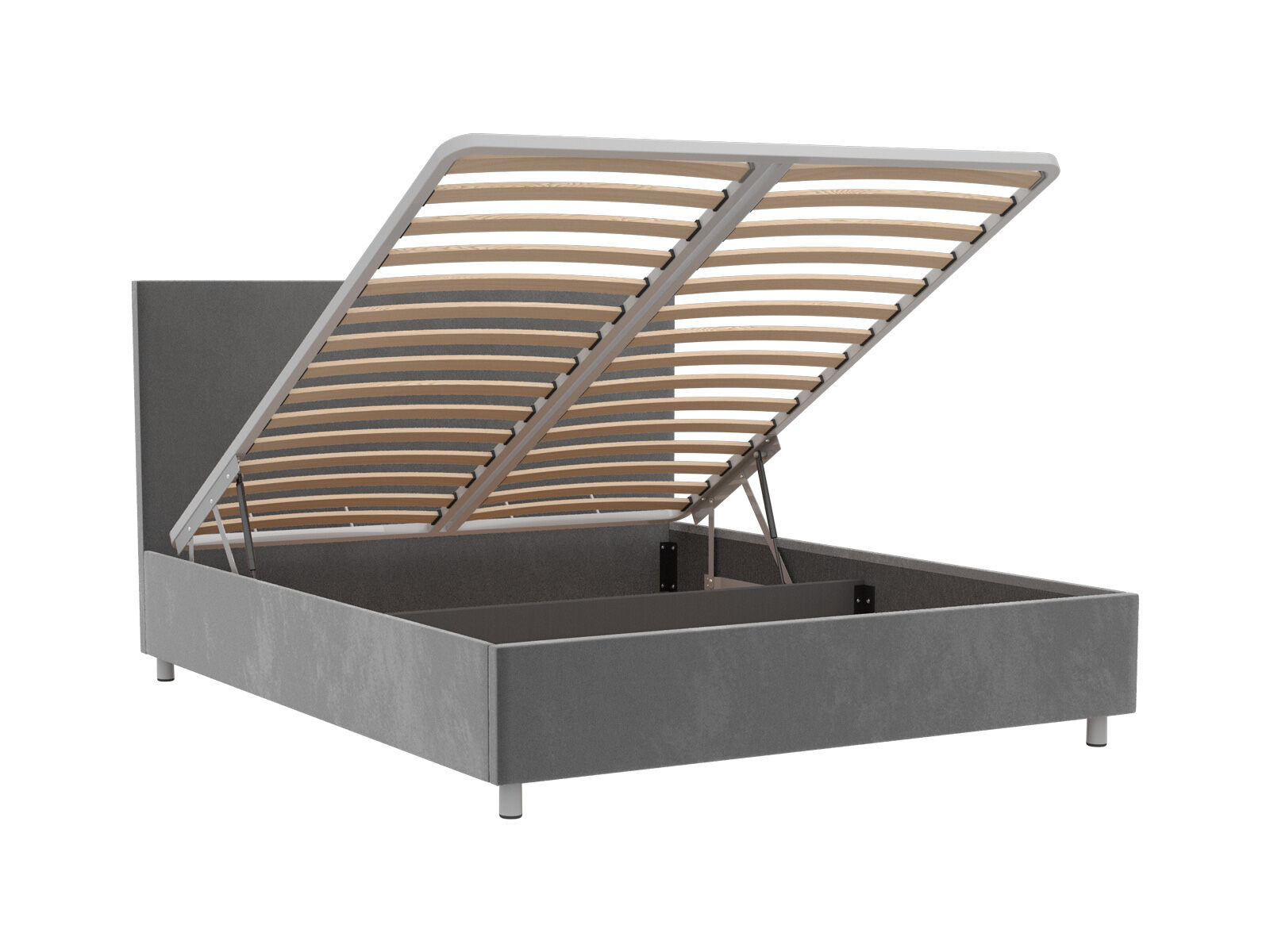 Кровать оснащена основанием с подъемным механизмом, под которым располагается бельевой ящик глубиной 16 см. Рекомендуемая высота матраса от 13 см, вес матраса до 50 кг. Чехлы на царгах несъемные. Высота/толщина царг: 28 см / 4 см (средняя), 2 см - (боковые).