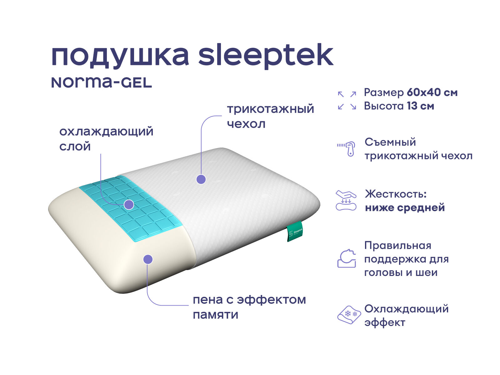 Анатомическая подушка классической прямоугольной формы. Наполнителем служит инновационная мемори – пена с эффектом памяти формы. Мемори, прогреваясь теплом тела, точно повторяет контуры головы и шеи спящего, что помогает быстро расслабить мышцы и ощутить комфортную поддержку шейного отдела. Специальный гелевый слой не дает подушке сильно нагреваться – гель обладает охлаждающим эффектом, что позитивно влияет на состояние кожи и глубину сна. Пробуждение утром будет легким и приятным, без отеков и усталости.