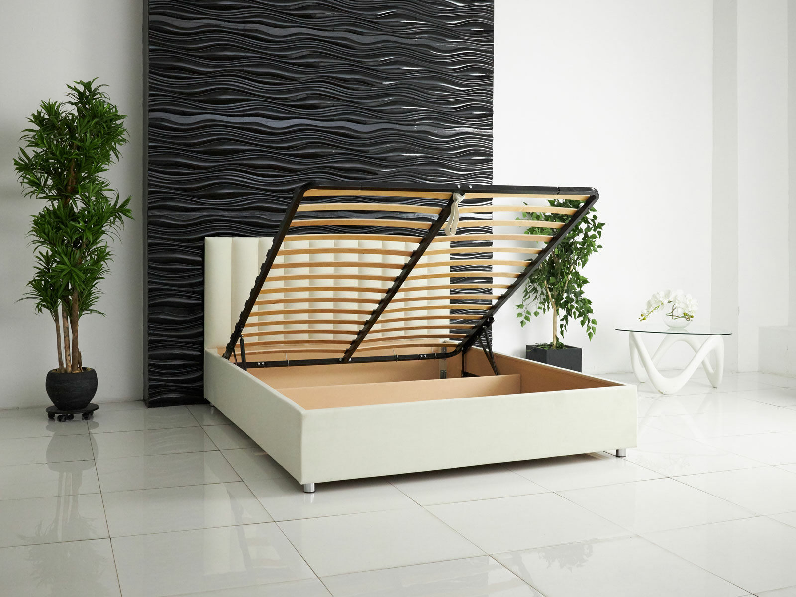 В комплектации с подъемным механизмом кровать имеет вместительный бельевой короб с двумя отделениями.