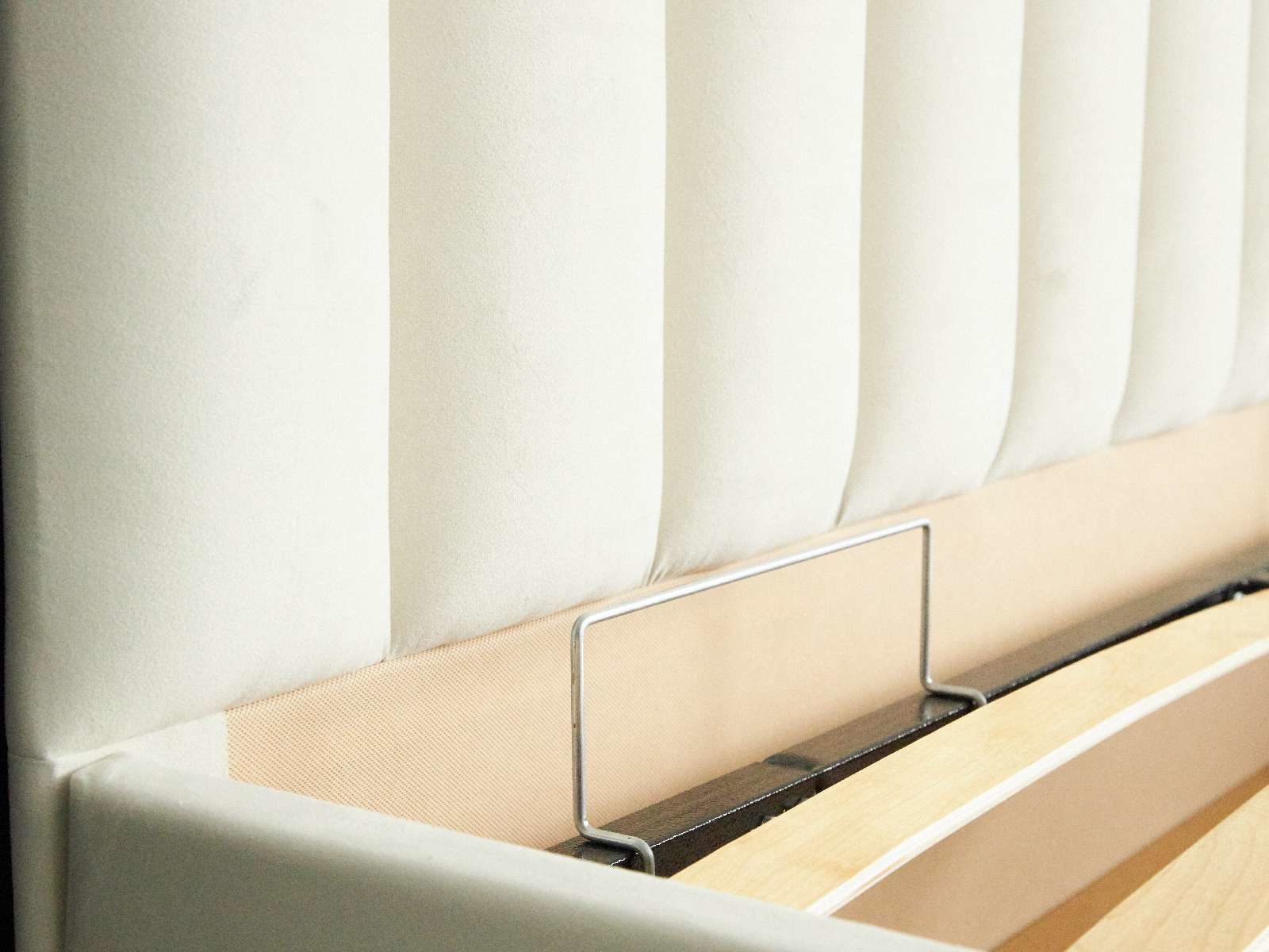 Кровать укомплектована металлическим основанием с подъемным механизмом. Такое решение подойдёт для тех, кто хочет получить дополнительное место для хранения. Просторный бокс под основанием позволяет складывать объёмные одеяла, постельное бельё и сезонные вещи.