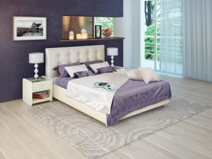 Современная модель среди интерьерных кроватей. Оригинальный рельеф изголовья, выполненный в виде квадратов с декоративной строчкой задает определенный ритм всему интерьеру спальни.