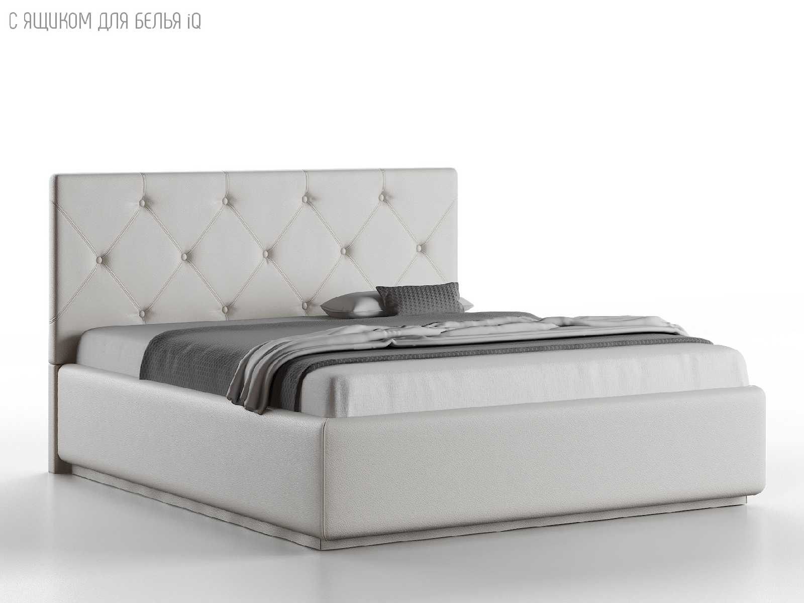 Кровать укомплектована IQ с подъемным механизмом и ящиком для белья без дна (дополнительная платная опция - дно к ящику IQ из HDF (ХДФ). Каркас кровати на цоколе, декоративный чехол на цоколе съёмный. Глубина ящика для белья - 30 см, без ограничения нагрузки на ящик.