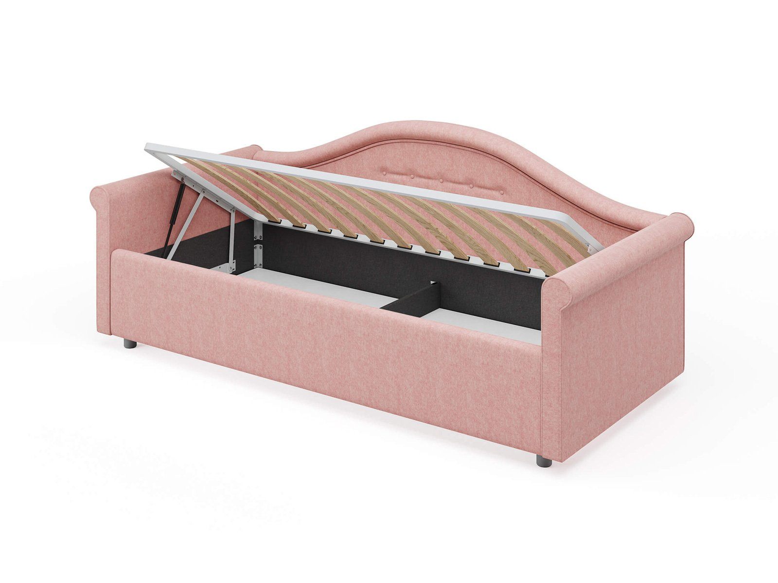 Кровать комплектуется металлическим основанием и подъемным механизмом со вместительным бельевым ящиком. Дно бельевого ящика легко сдвигается для обеспечения уборки под кроватью.