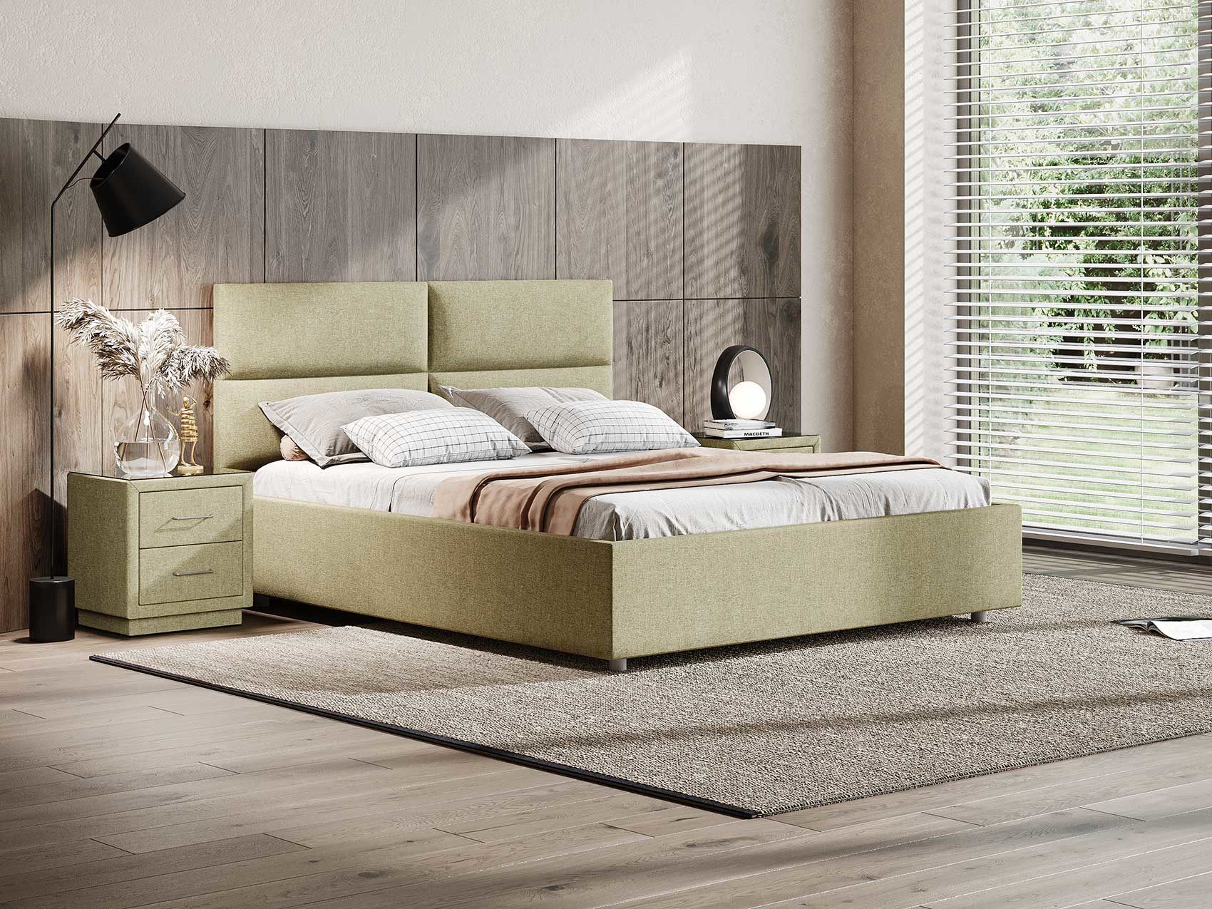 Лаконичная модель с изголовьем из объемных прямоугольников, сшитых между собой. Царги кровати выполняются по технологии съемного чехла. Модель изготовлена из ДСП. Обратная сторона изголовья обита спандбондом, но, при желании, её можно выполнить из основного обивочного материала.