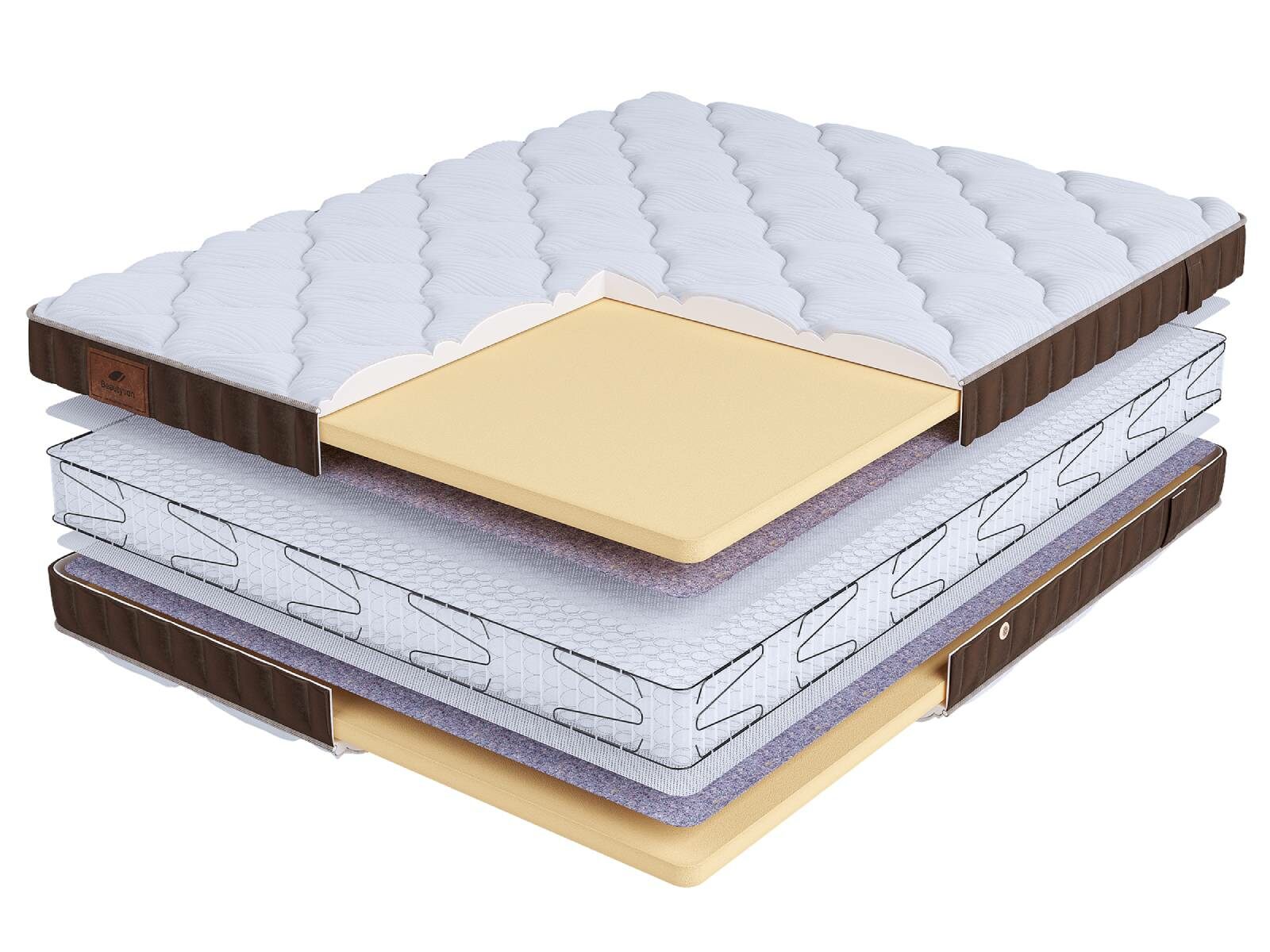 Хлопковая трикотажная ткань чехла обеспечивает комфорт и обладает отличной воздухопроницаемостью. Высокообъемная стежка с использованием холлофайбера (600гр.) подарит дополнительный комфорт спальному месту. Изысканный бурлет из мягкого велюра красивого бежевого цвета придает матрасу роскошный внешний вид и подчеркивает его премиальный статус. Каждая модель серии LIFE украшена фирменной кожаной биркой BeautySon, подтверждающая исключительность каждого матраса.