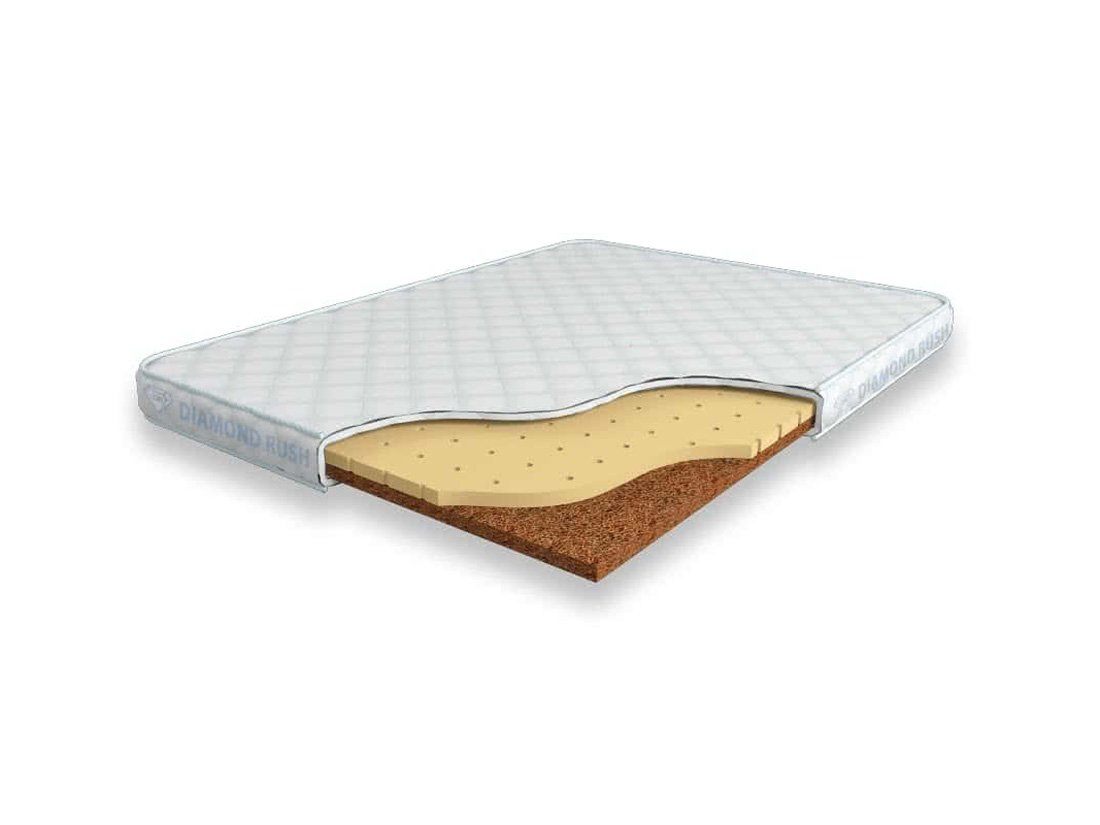 Матрас Diamond Rush Cocos Contrast 6 DR является беспружинным, т.е. не имеет в своей основе пружинного блока. Особенность этой модели в том, что она сочетает в себе сразу мягкий и жесткий матрасы. С одной стороны идет слой латексированной кокосовой койры (3см), с другой – натурального латекса с перфорацией (3см).