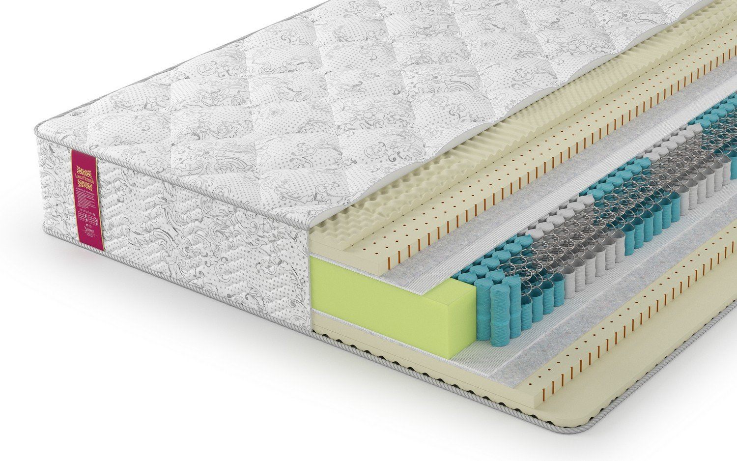 С каждой из сторон модели установлены по две латексные плиты с различной перфорацией и плотностью. Один слой имеет равномерную структуру, а второй разделён на 5 зон, которые также, как и пружинный блок обеспечивают максимально правильную поддержку для спины тела.