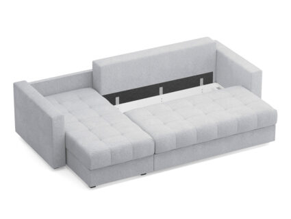 Диван имеет угловую конфигурацию, что позволяет ему идеально вписаться в любой интерьер. Угловая секция, или оттоманка, устанавливается как справа, так и слева, в зависимости от предпочтений и особенностей планировки комнаты, делая диван универсальным решением для любого пространства. Модель оснащена вместительным бельевым коробом, что позволяет эффективно использовать пространство и хранить постельные принадлежности или другие вещи. Матрас средней жесткости обеспечивает оптимальную поддержку и комфорт во время сна, что важно для ежедневного использования.