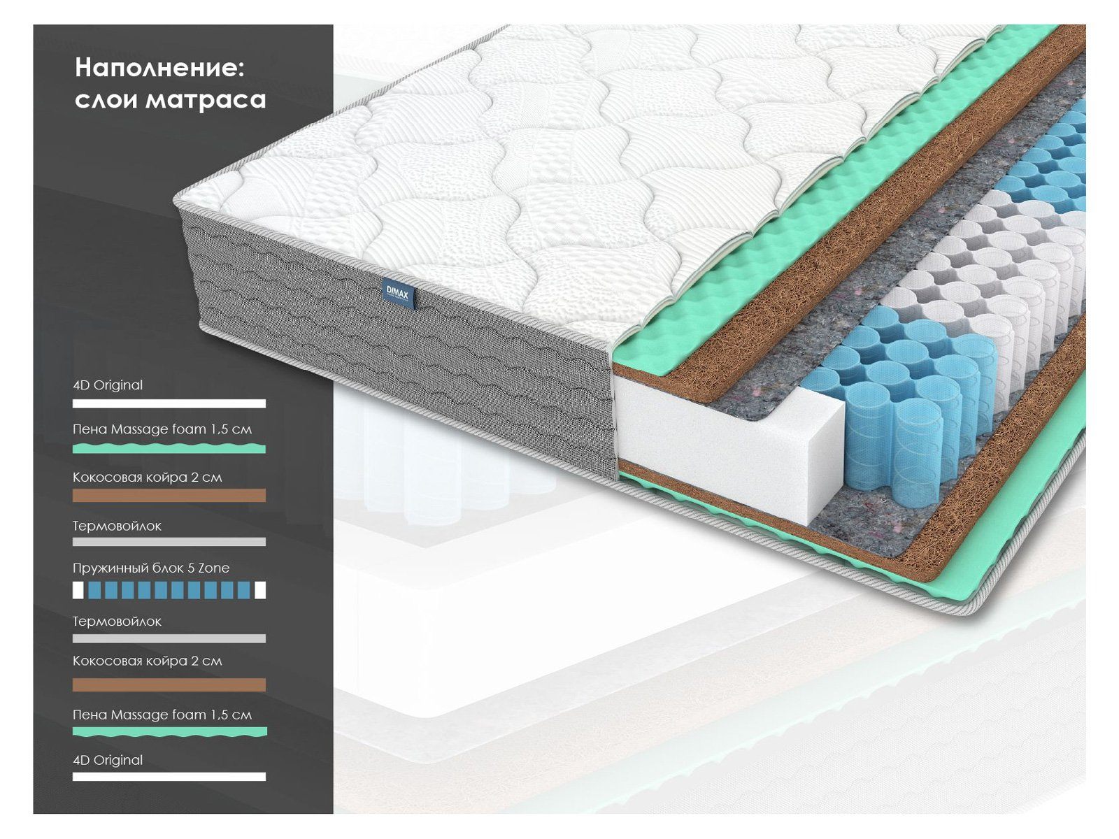 Димакс ОК Хард Релакс – это ортопедический матрас с максимально высокой жёсткостью среди массажных моделей серии ОК. В основе лежит пятизональный независимый пружинный блок и гипоаллергенные материалы, обеспечивающие правильную ортопедическую поддержку и выраженный массажный эффект.