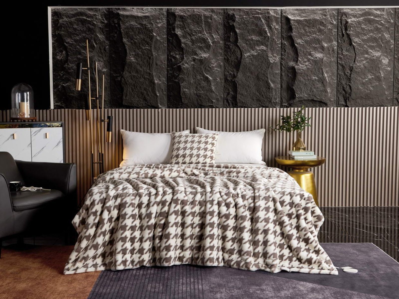 Sofi De Marko представляет вашему вниманию коллекцию Эрнесто, включающую в себя пледы и декоративные наволочки из искусственного меха с принтом «гусиная лапка».