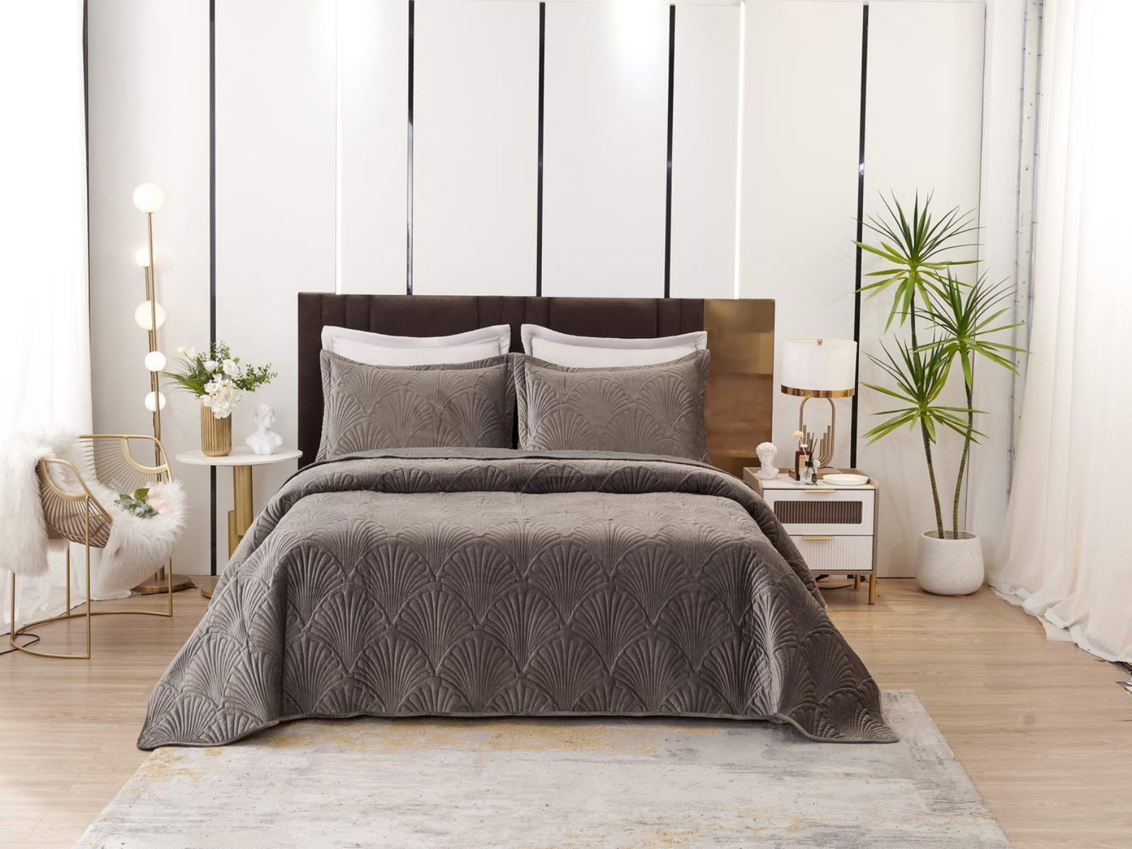 Роскошное велюровое покрывало Ариэль станет изюминкой любого интерьера, ведь оно потрясающе выглядит и приятное на ощупь. Обратите внимание на стежку покрывала – она выполнена в виде ракушек с эффектом 3D. Из-за особого плетения, велюровая ткань покрывала отражает свет и красиво переливается при различном освещении.
