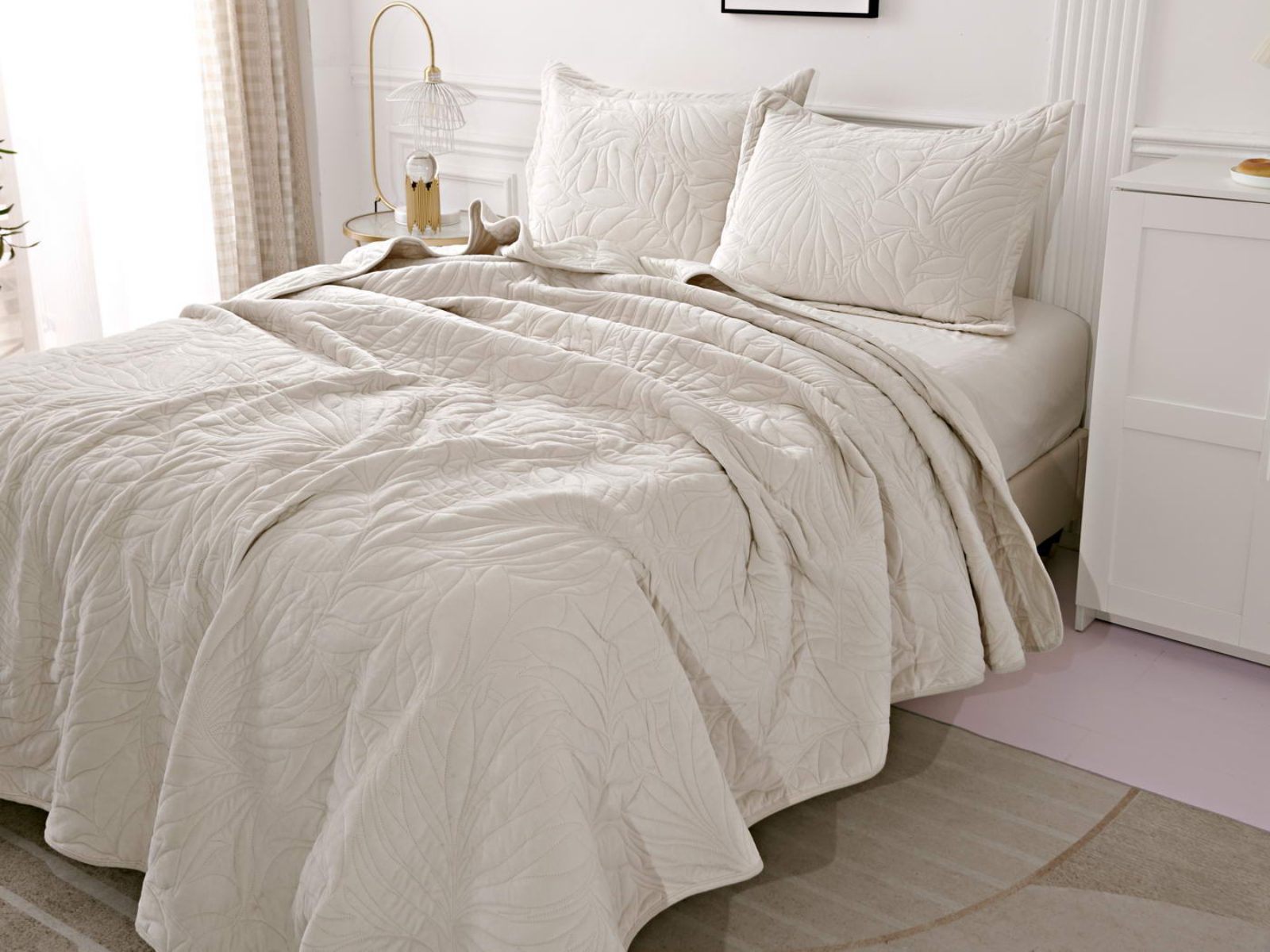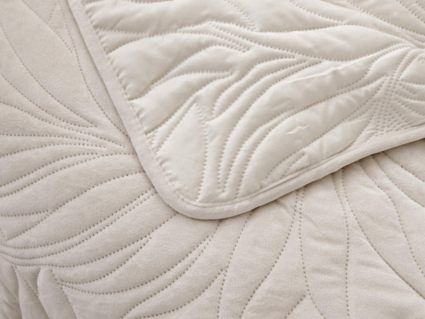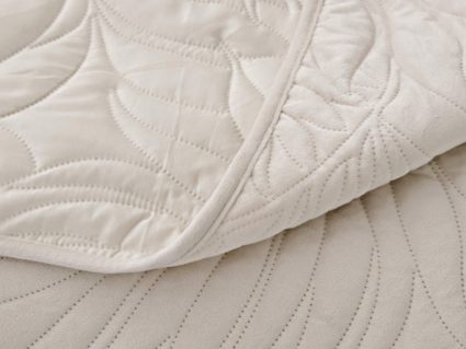 Стёганое покрывало Глория изготовлено из 100% вискозы, что делает его невероятно мягким и комфортным. Рисунок напоминает листья лавра. Такой орнамент подойдет большинству современных интерьеров.