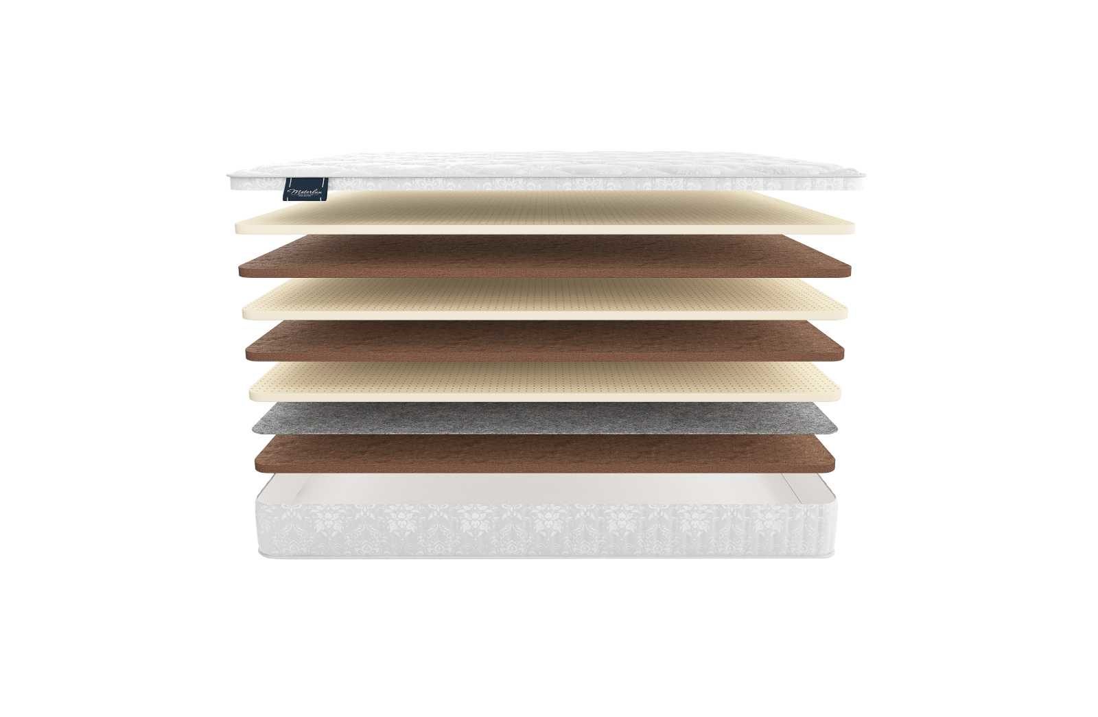 Если снять чехол, то перед нами предстанет шестислойный блок. Внешне это напоминает своеобразный сэндвич, состоящий из чередующихся слоёв натурального латекса и койры кокоса. Толщина каждой из плит составляет 3 см.